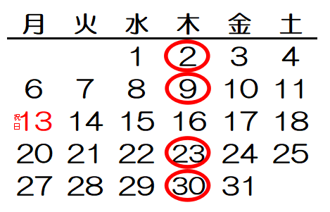 赤丸:終日休診(日曜祝日定休)となります。休診に際し、予防接種や再診の日程等でご不明な点がございましたら、当院までお気軽にお問合せ下さい。